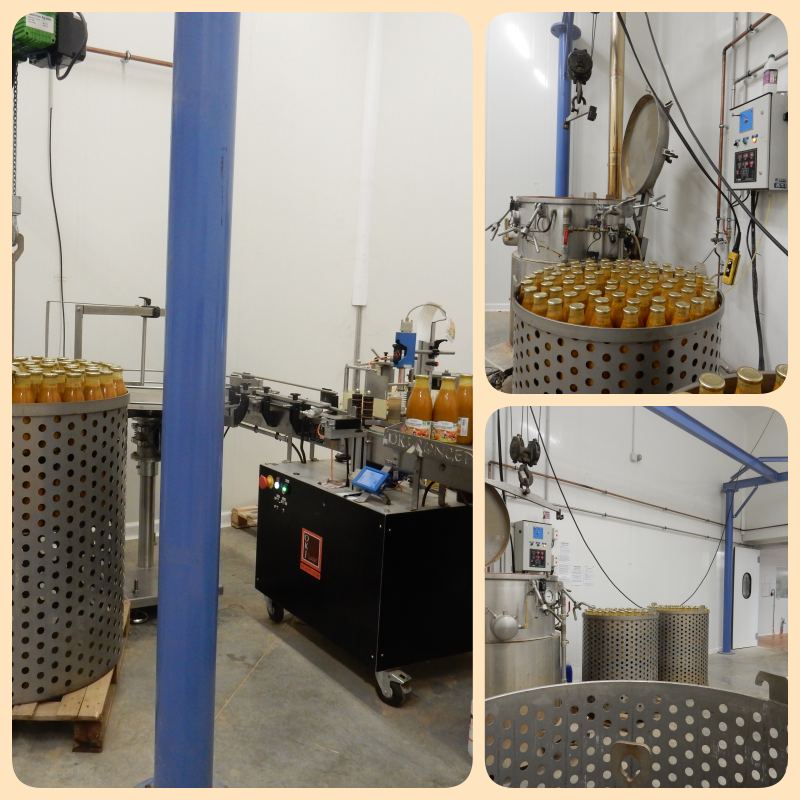 - Un espace pour la stérilisation de nos produits en prolongement de notre atelier cuisson et du poste d’embouteillage. Dans la même pièce, notre nouvelle étiqueteuse où nous posons l’étiquette, apposons le tampon sur la capsule du pot (traçabilité) et où nous conditionnons les produits en cartons.
