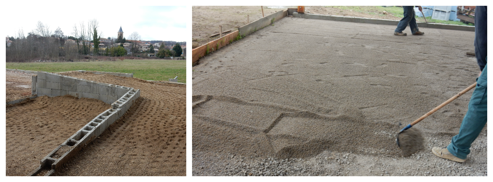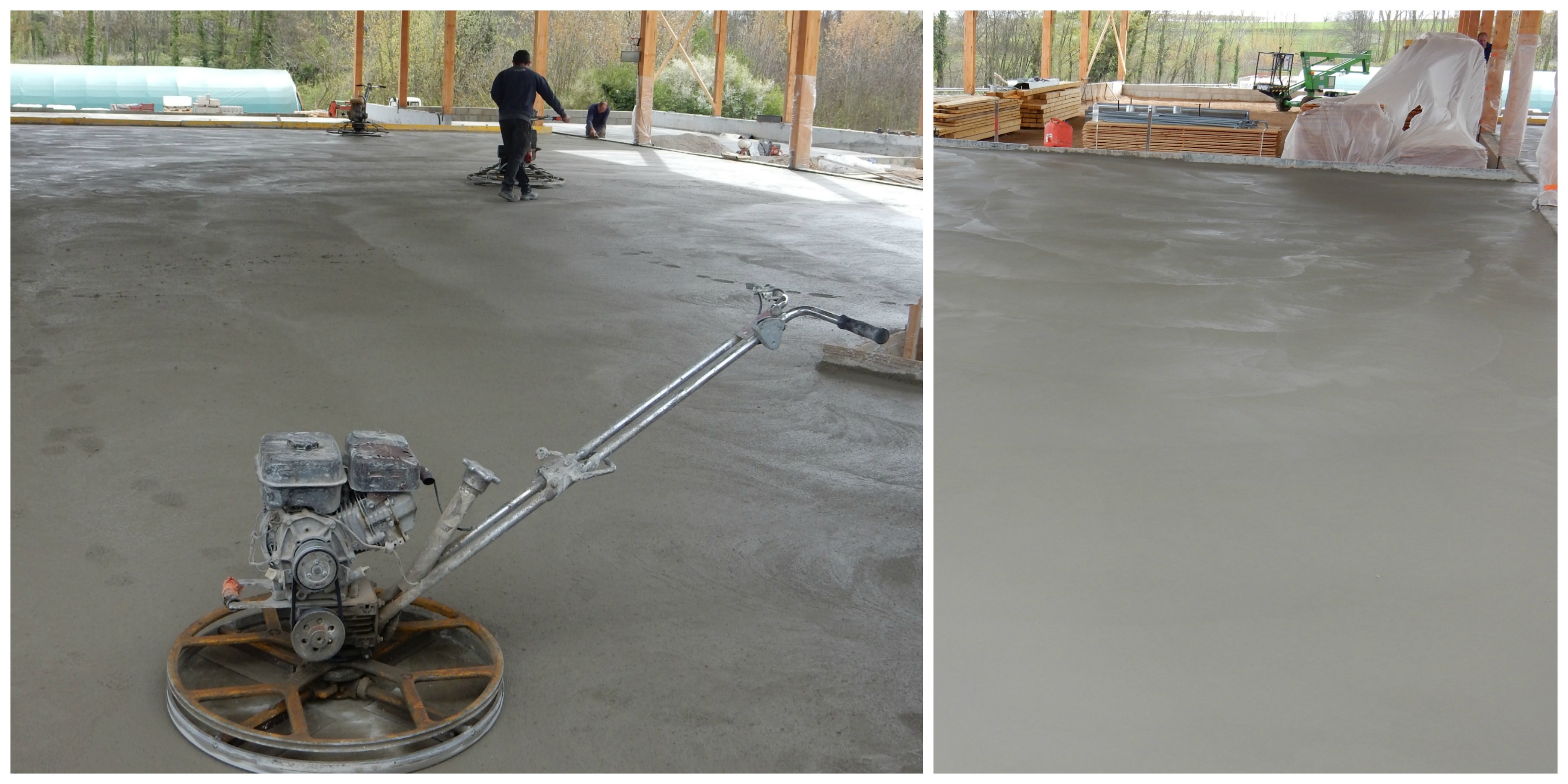 La préparation des dessous de dalles a été réalisée par nous-mêmes, puis, après validation, une entreprise spécialisée est venue couler les 900 m² : coulage à la pompe, finition lissée… Nous aurons besoin de rouler en chariot élévateur pour stocker et déplacer nos palettes (contenants vides, caisses de stockage…) et d’utiliser des gerbeurs et chariots électriques dans notre nouvelle salle de stockage de produits finis. Le résultat est impeccable. Pour la partie du bâtiment destinée au matériel agricole, nous restons en sol terre pour l’instant.