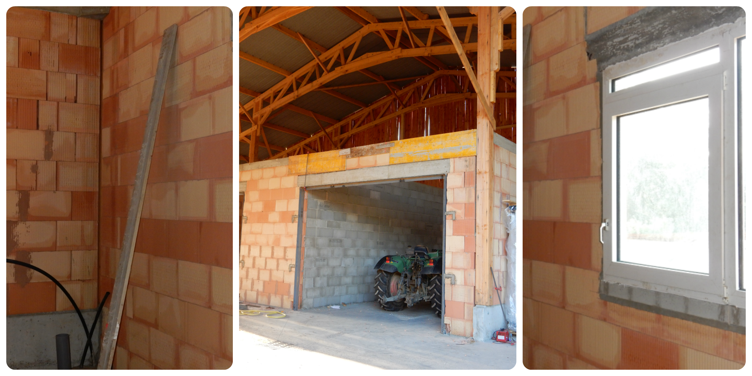 Dans notre projet d’extension de bâtiment, nous avions prévu depuis longtemps de consacrer une partie pour la mécanique car nous n’avions rien de très fonctionnel jusqu’à présent : entretien régulier des engins agricoles, rangement de l’outillage, pièces d’irrigation… Nous avons construit cet atelier en briques avec de grandes ouvertures et y avons prévu une fosse pour la mécanique des tracteurs.