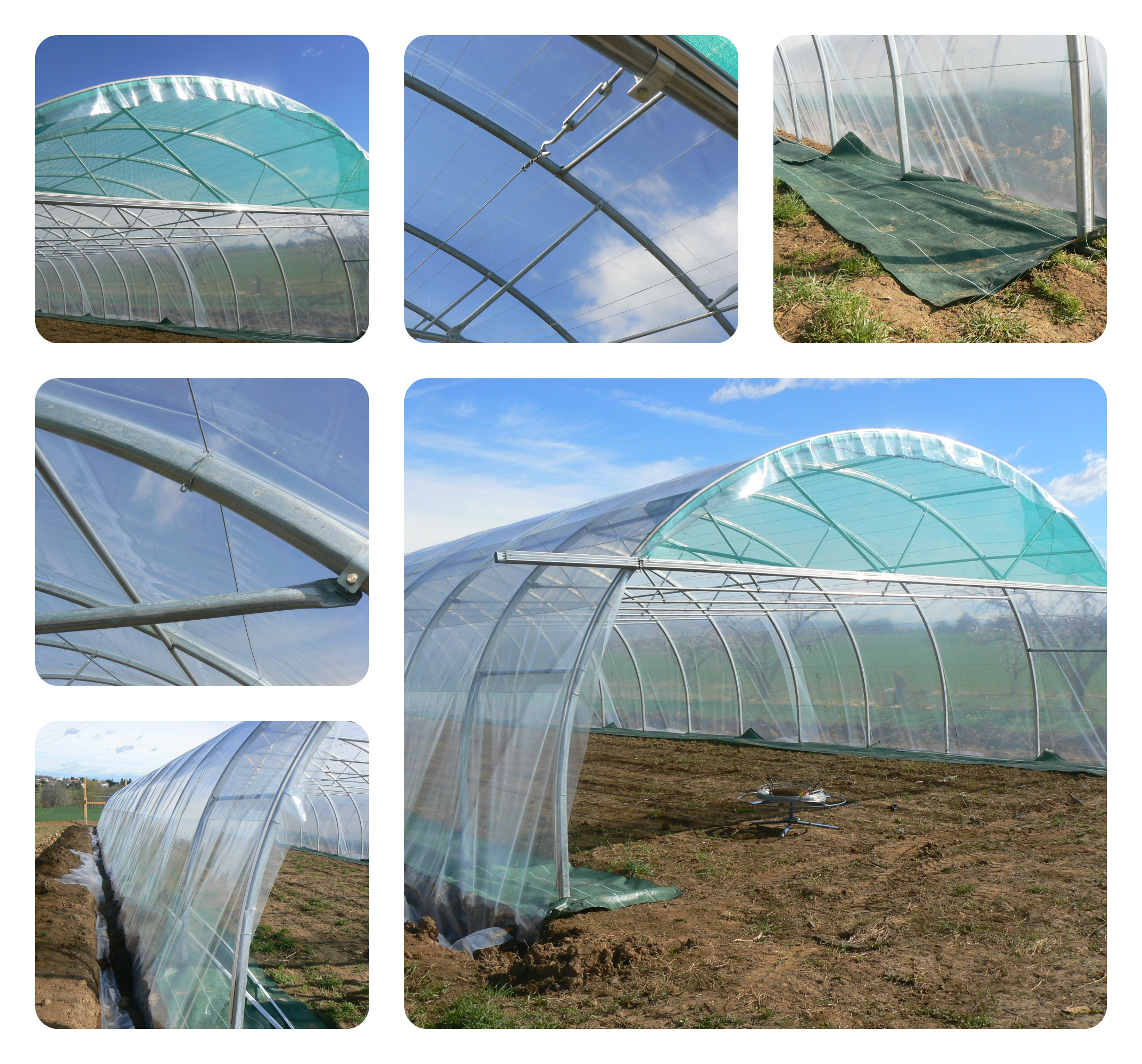 Cette année, nous implantons de nouveaux tunnels pour augmenter encore nos surfaces de culture de tomates. Nous avons réalisé le montage de 4 tunnels 8 m en même temps : mise en place des arceaux, barres de cultures et fils de fer, têtes de serre en filet brise-vent, bordures intérieures en toile hors-sol pour éviter l’enherbement …