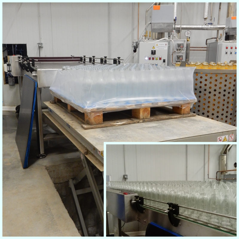 Côté approvisionnement des contenants vides, dans la pièce jouxtant la salle de cuisson, une table élévatrice permet d’avoir la palette de pots/bouteiles toujours à hauteur, au même niveau, et une table de chargement en amont du poste d’embouteillage, permet de stocker les contenants nécessaires pour une fabrication et d’approvisionner régulièrement et automatiquement le convoyeur de la ligne de dosage.
